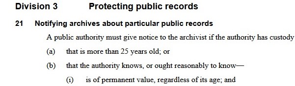 Section 21(a) is an existing obligation (previously s.10 of the repealed Public Records Act 2002). Section 21(b) is a new requirement, where public authorities must notify the State Archivist if the authority knows, or ought reasonably to know, that it has permanent value public records in their custody which are at risk of loss or damage. This includes records stored with other entities.
